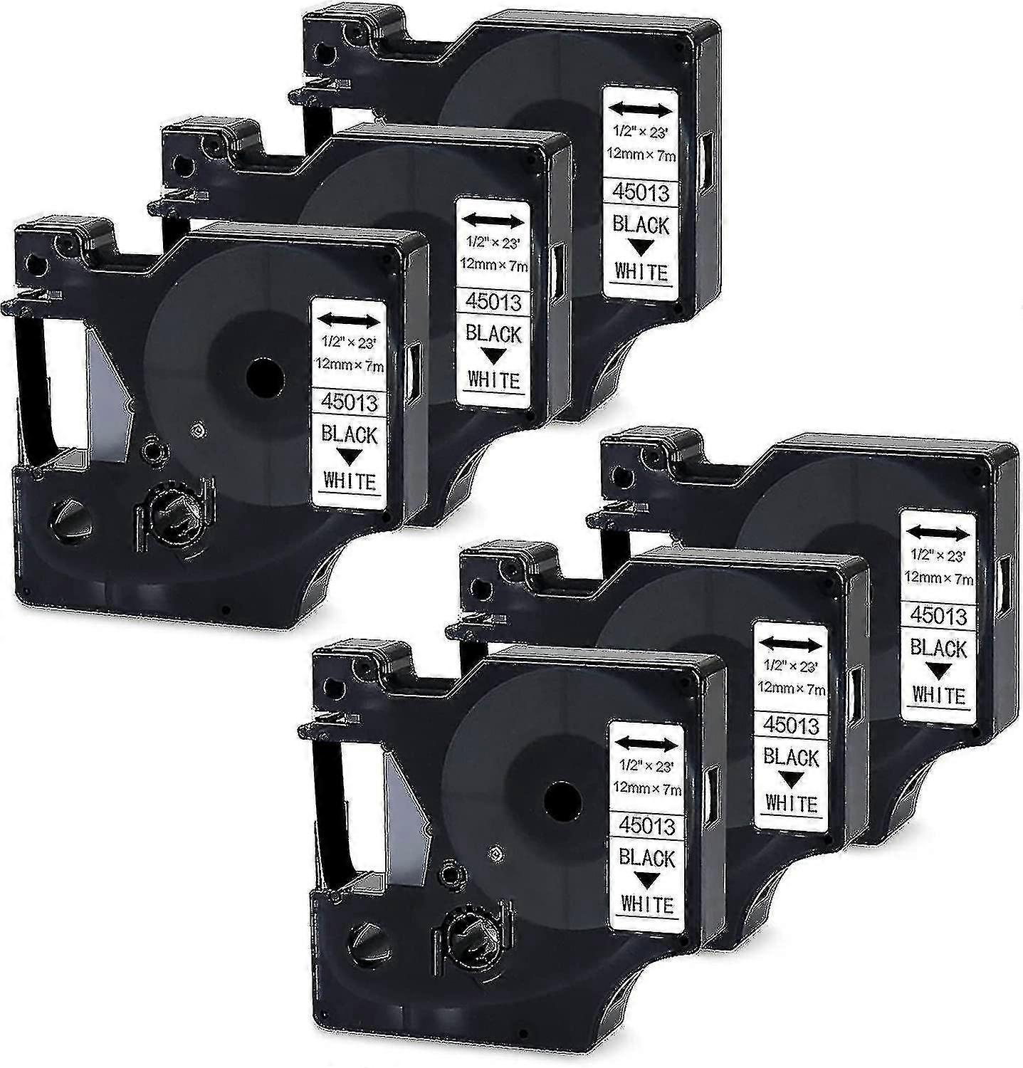 Color: Black on White. Width: 1/2 Inch (12mm), Length: 23 Feet (7m), Package Included: 5 pack Compatible With Dymo D1 Label Tape. Thermal print technology requires no ink or toner. NON-OEM^ Easy Peel Backing: split lengthways in the middle of label tape for easy peeling. Easy remove without leaving behind residue^ Long Lasting & Durable: The replacement for Dymo D1 Label Tape can adheres to most clean, flat surfaces including plastic, paper, metal, wood and glass. Also, it is water resistant, chemical resistant, high temperature resistant, abrasion resistant, grease resistant and fading resistant, perfect for Indoor and outdoor use^ Used for -- Compatible with Dymo d1 Label Maker: Dymo LabelManager 100, LabelManager 120P, LabelManager 150, LabelManager 160, LabelManager 200, LabelManager 210D, LabelManager 220P, LabelManager 260P, LabelManager 280, LabelManager 300, LabelManager 350, LabelManager 350D, LabelManager 360D, LabelManager 400, LabelManager 420P, LabelManager 450, LabelManager 450D, LabelManager 500TS, LabelManager Plug N Play, LabelManager PC II, LabelManager PC, LabelManager Wireless Plug N Play^ Make Your Life More Efficient: The label cassette widely used in office, school, home, factory, warehouse, hotel, lab, supermarket, ect. Make your life organized and tidy easy with labeling Our products are made with the highest quality materials and are designed to provide you with the best possible user experience. We strive to ship out all orders within three days of purchase, and the estimated delivery time is 8-15 days. When shopping, please pay attention to the size and dimensions of the product to ensure that it meets your needs. In the title and , we have provided detailed information about the product, including its features and specifications We want you to be completely satisfied with your purchase, so if you have any questions or concerns, please don""""""""t hesitate to contact us. We are here to help and will do our best to assist you. Thank you for choosing our product. We hope you enjoy it When shopping, please pay attention to the size and dimensions of the product to ensure that it meets your needs. In the title and , we have provided detailed information about the product, including its features and specifications We want you to be completely satisfied with your purchase, so if you have any questions or concerns, please don't hesitate to contact us. We are here to help and will do our best to assist you. Thank you for choosing our product. We hope you enjoy it