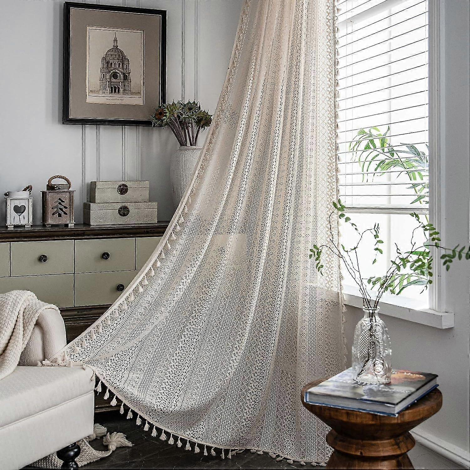 Beige Rustic Curtain Cotton Crochet Curtain Chic Vintage Drape Rod Pocket Lace Macrame Curtains for Kitchen,Dining Room,Living Room