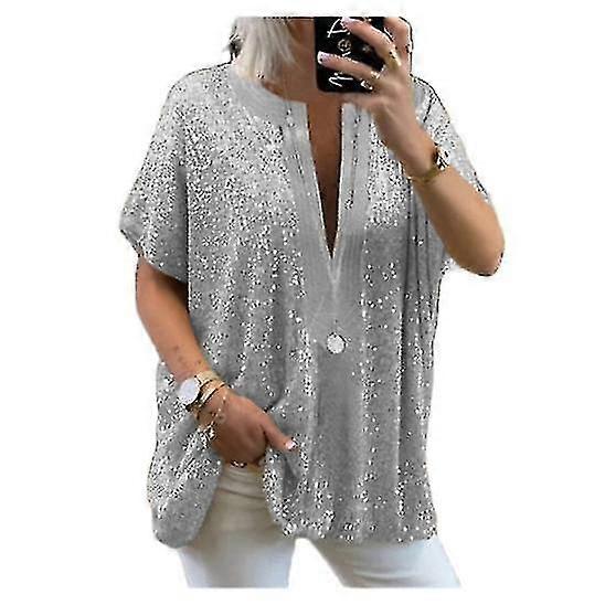 Sequins V Neck Short Sleeve Casual T Shirts Tops Summer Women Shirt Blouse