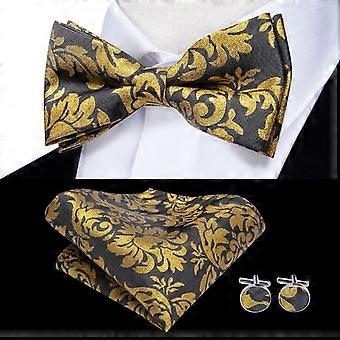 الجاكار الحرير الأسود الذهب المشارب رجل ربطة عنق الكبار القوس التعادل هانكرمنديل أزرار الأكمام مجموعة الرجال مربوطة مسبقا فراشة Bowknot هدية