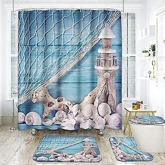 Marine Life Blue Shabby Shell Beach Vintage White Wood 4 Piece Shower Curtain Set With Non Slip Mats Toilet Lid And Bath Mat Bathroom Decor Set 72" X