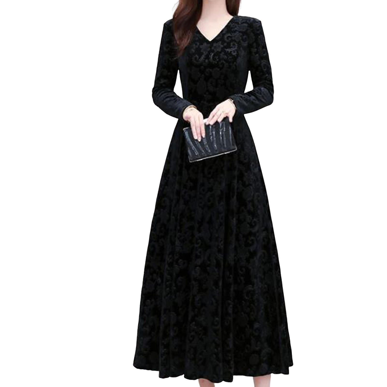 V Neck Long Sleeves Waist Tight A-Line Unique Pattern Women Dress Spring Autumn Pleated Loose Hem Solid Color Velvet Maxi Dress