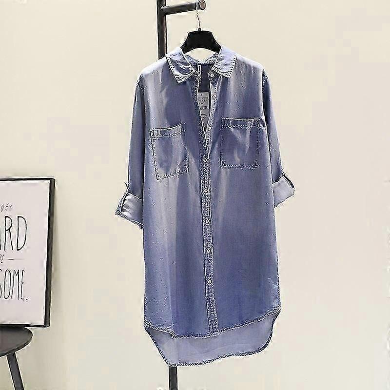 Spring Solid Denim Shirt Dress Casual Tops Fashion Pocket Long Sleeve Shirt For Women Elegant Medium Length Loose Clothes 24120