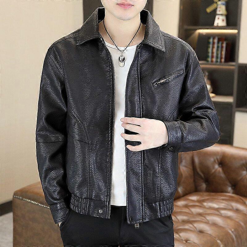 Spring Solid Color Polo Collar Imitation Leather Clothing Coat Top Men Fashion Brands Casual All-Match Pu Leather Jacket