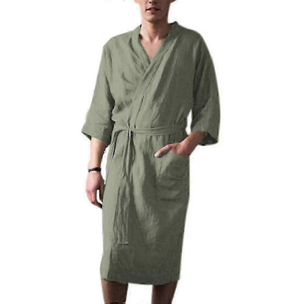 Men Bath Robe Cotton Linen 3/4 Sleeve Nightwear Sleepwear Bathrobe Dressing Gown PQD