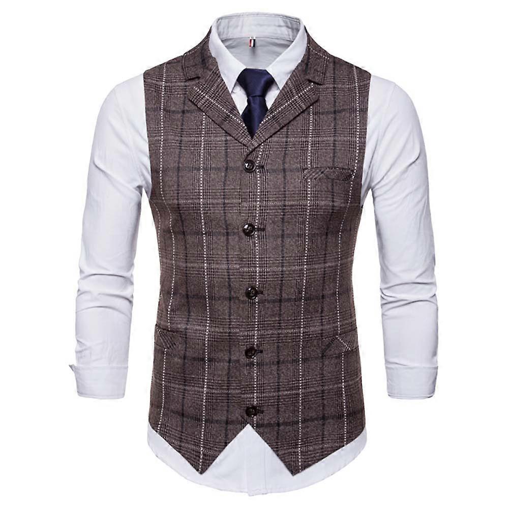 Men Plaid Pattern Single-breasted Sleeveless Formal Waistcoats Dress Suit Vest (Coffee 4XL)