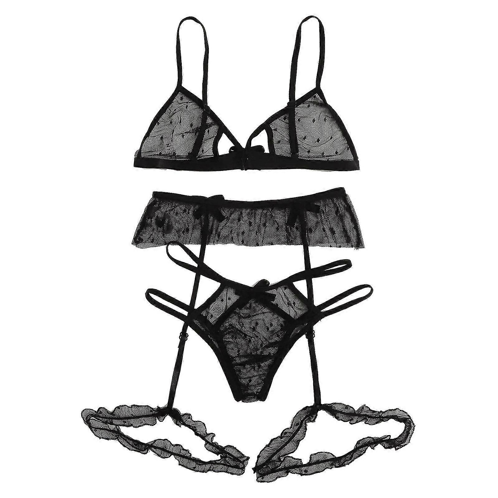 Ladies Mesh Three-point Suit Black Sexy Mesh See-through Bra Panty Garter Belt