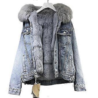 Winter Women's Denim Jacket Fleece Cushion Fur Collar
