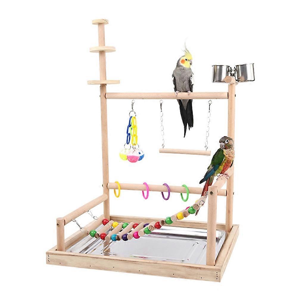 Bird Perch Wood Stand Toy Parrots Playstand with Feeding Cups Ladder Chew Toy