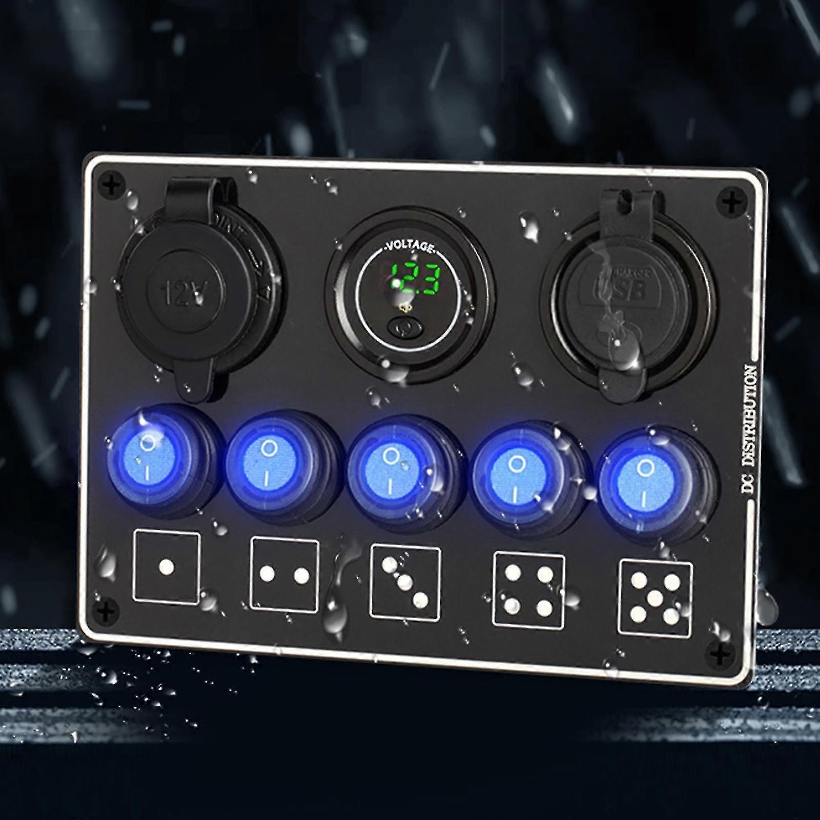 Universal 5 Gang Rocker Dual Usb Charger Led Volmeter With Switch 12v Outlet Pre-wired Switch Panel For Car Truck Boat Marine Suv