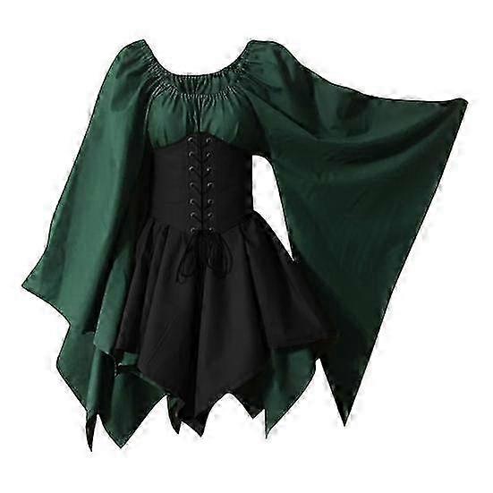 Medieval Vintage Fairy Elf Costume Dress with Long Bell Sleeves - Retro Waist Cinching Patchwork Dress for Women's Halloween Cosplay