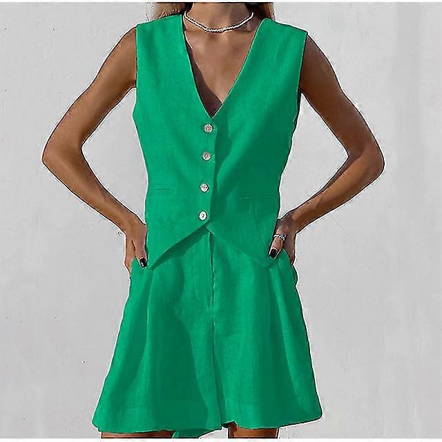 Cotton Linen Waistcoat Shorts Solid Suit Women Elegant Fashion Sleeveless V Neck Vest Two Piece Set Summer Loose Casual Outfit