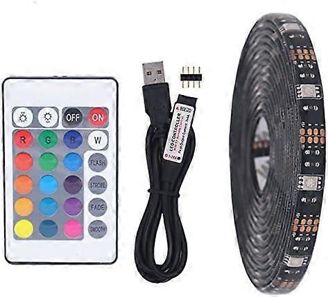 Specification: Type: 5V USB RGB LED strip light Materia l: Plastic, resin Board width: 10mm PCB Color: Black Waterproof: No LED Type: SMD 5050 LED Quantity: 30LEDs/m p> Strip length: 5m USB cable length: 0.5m Light color: RGB Beam angle: 120 degrees Voltage: DC 5V Storage temperature: -40 ~ 80 Celsius Operating temperature: -25 ~ 60 Celsius Remote control: 24Key Remote Certification: CE, FCC, RoHS, CCC Features: Flexible RGB LED strip creates new lighting effects colorful and exciting lighting, once impossible to achieve. Ideal for cove, platoon, shelf or closet lighting or in commercial applications, product displays, under counters lightings this LED strip comes by the meter in a different color, with indoor or outdoor rating. Driven by all devices with 5V output USB port, such as computer, desktop, laptop, tablet, label, car cigarette lighter. Environment friendly, no radiation, no flicker, no harm to human eyes. Energy saving, no heat, low power consumption, stable performance. This tape comes with strong adhesive blue self-adhesive tape for easy application to almost any surface clean. Package including: 1 * 5m USB RGB LED light strip 1 * 24 key remote control