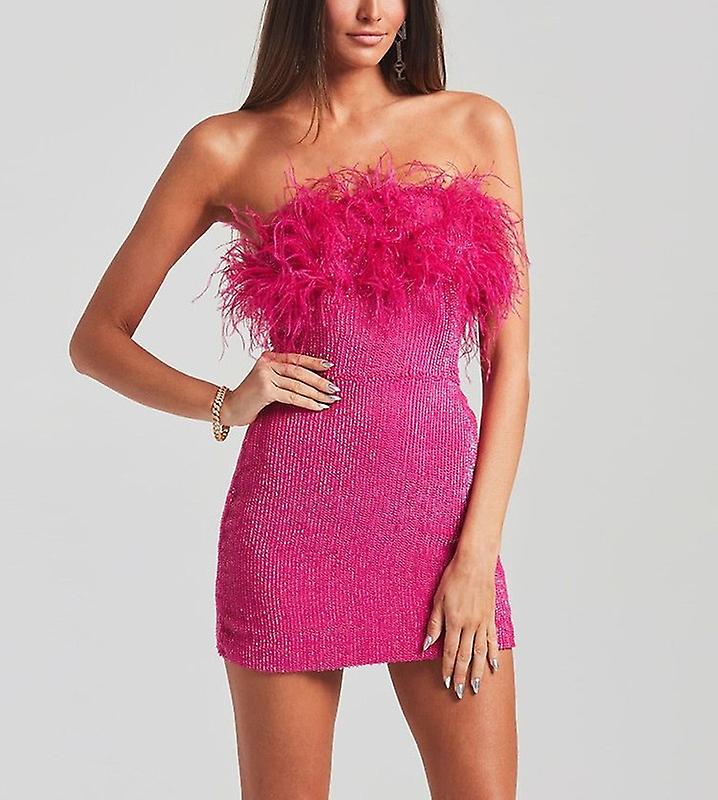 Women's Sparkly Sequin Dress Strapless Feather Tube Dress Sexy Bodycon Mini Dress Prom Dresses