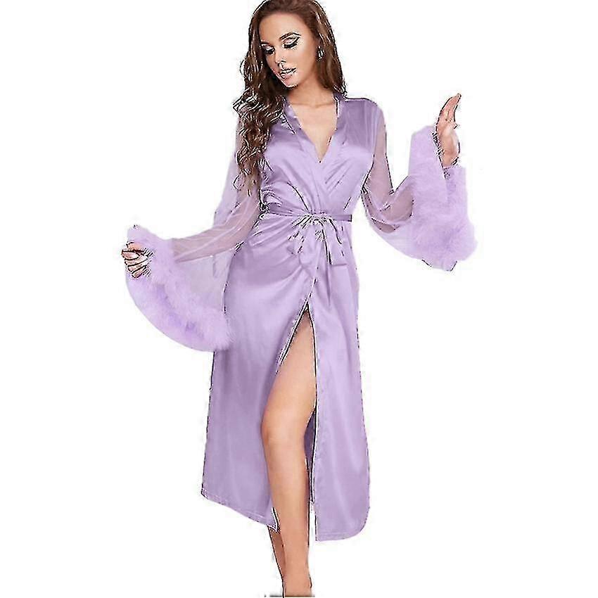 Women Silk Robes Long Satin Feather Trim Dressing Gown