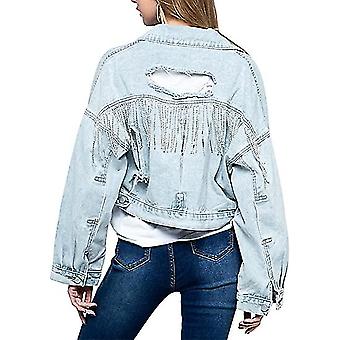 Womens Denim Jacket With Fringe Rhinestones Sleeve Distressed Ripped Denim Jackets With Pockets