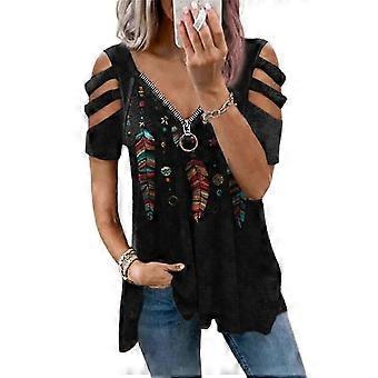 Women Zip V-neck Summer T-shirt Short Sleeve Casual Tops