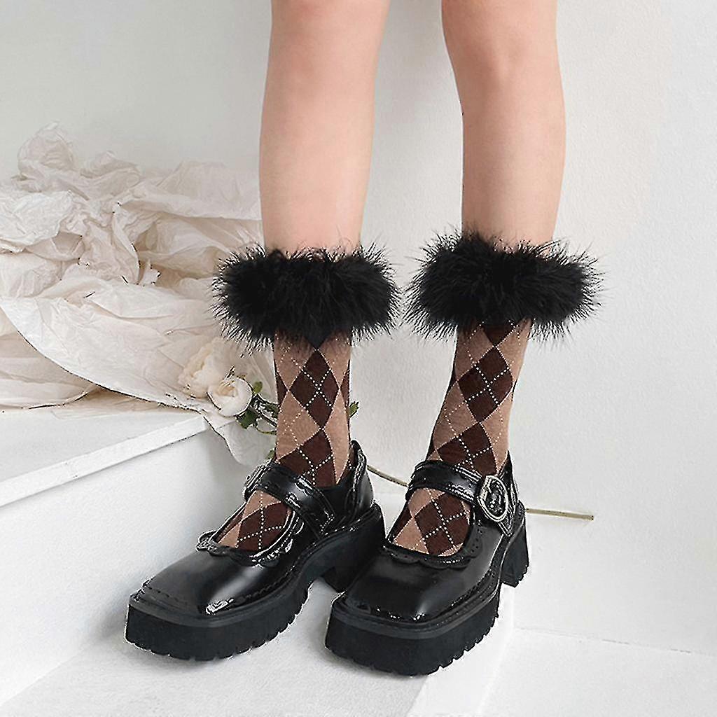 Women Winter Sweet Furry Feather Trim Calf Socks Harajuku Preppy Style Argyle Rhombus Diamond Plaid Pattern Student Mid Tube Hosiery Stockings