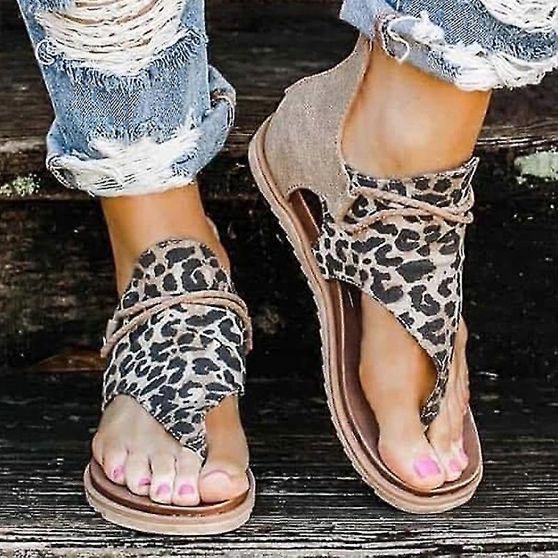 Women Leopard Sandals Clip Toe Summer Beach Flip Flops Gladiator Flat Comfy Shoes