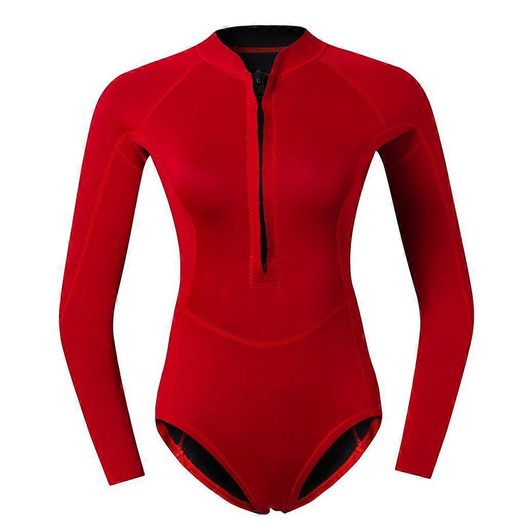 Women Neoprene Sleeve Wetsuit Front Zip Diving Bikini Suit Red L