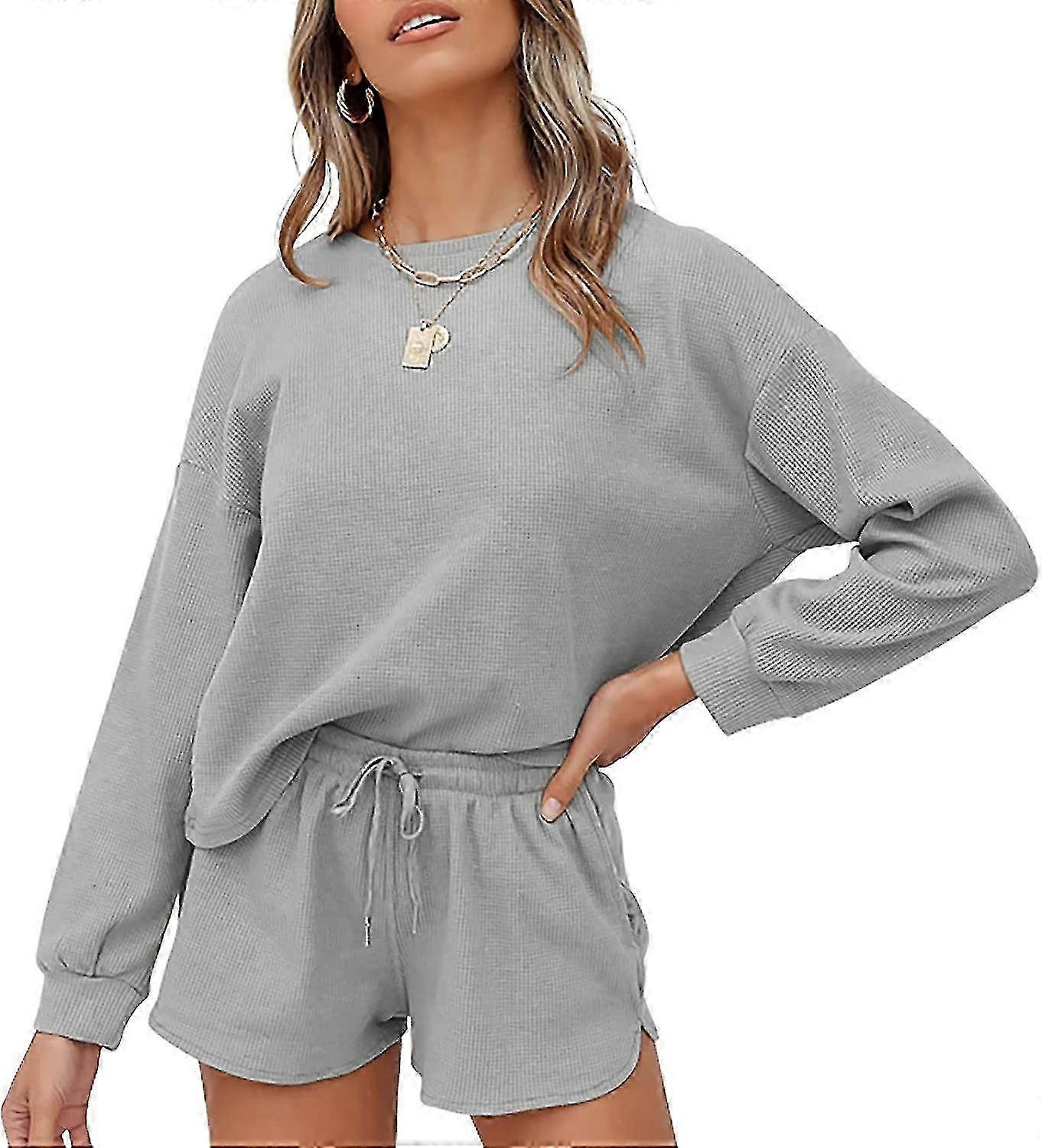 Women's Waffle Knit Long Sleeve Top and Shorts Pullover Nightwear Lounge Pajama Set with Pockets
