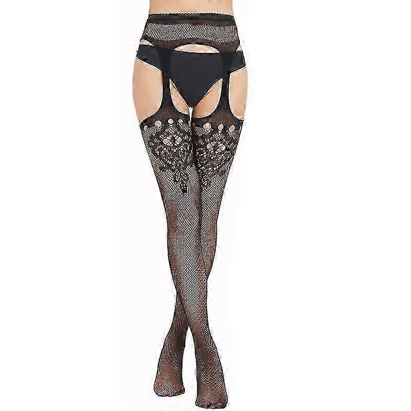 Women Black Lace Jacquard Fishnet Tights Suspender Thigh High Pantyhose High Waist Garter Belt Stockings Lingerie