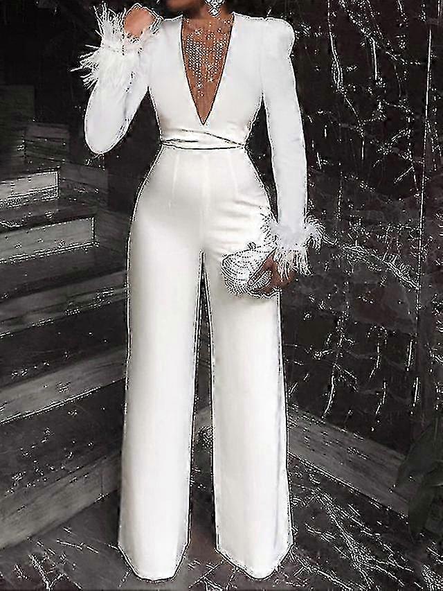 Women's Jumpsuit Feather Solid Color Deep V Elegant Party Evening Prom Wide Leg Slim Long Sleeve White