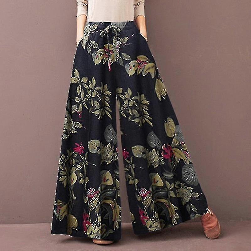 Women Boho High Waist Long Pants Elastic Waisted With Pockets Bottoms Holiday Baggy Floral Print Trousers
