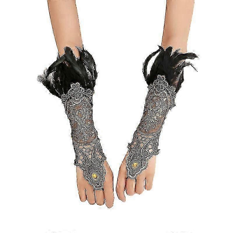 Women's Vintage Feather Lace Fingerless Long Gloves Stretch Wrist Cuffs Bracelet For Wedding Halloween Party