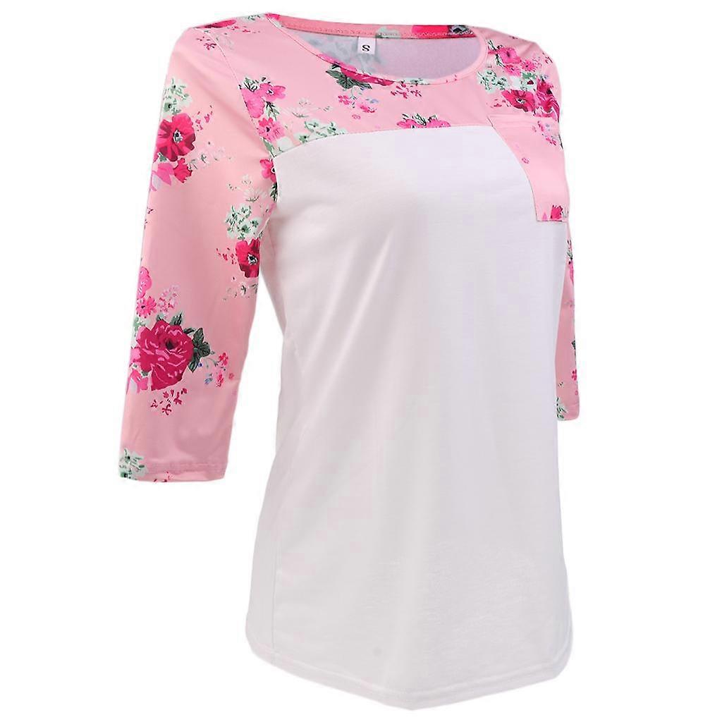 Women Splice Contrast Color Floral Print 3/4 Sleeve Blouse Shirts S White