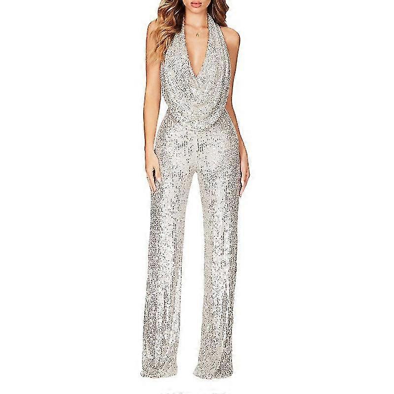 Women's Sexy Halter Cowl Neck Sparkly Jumpsuits,Sleeveless Elegant Sequins