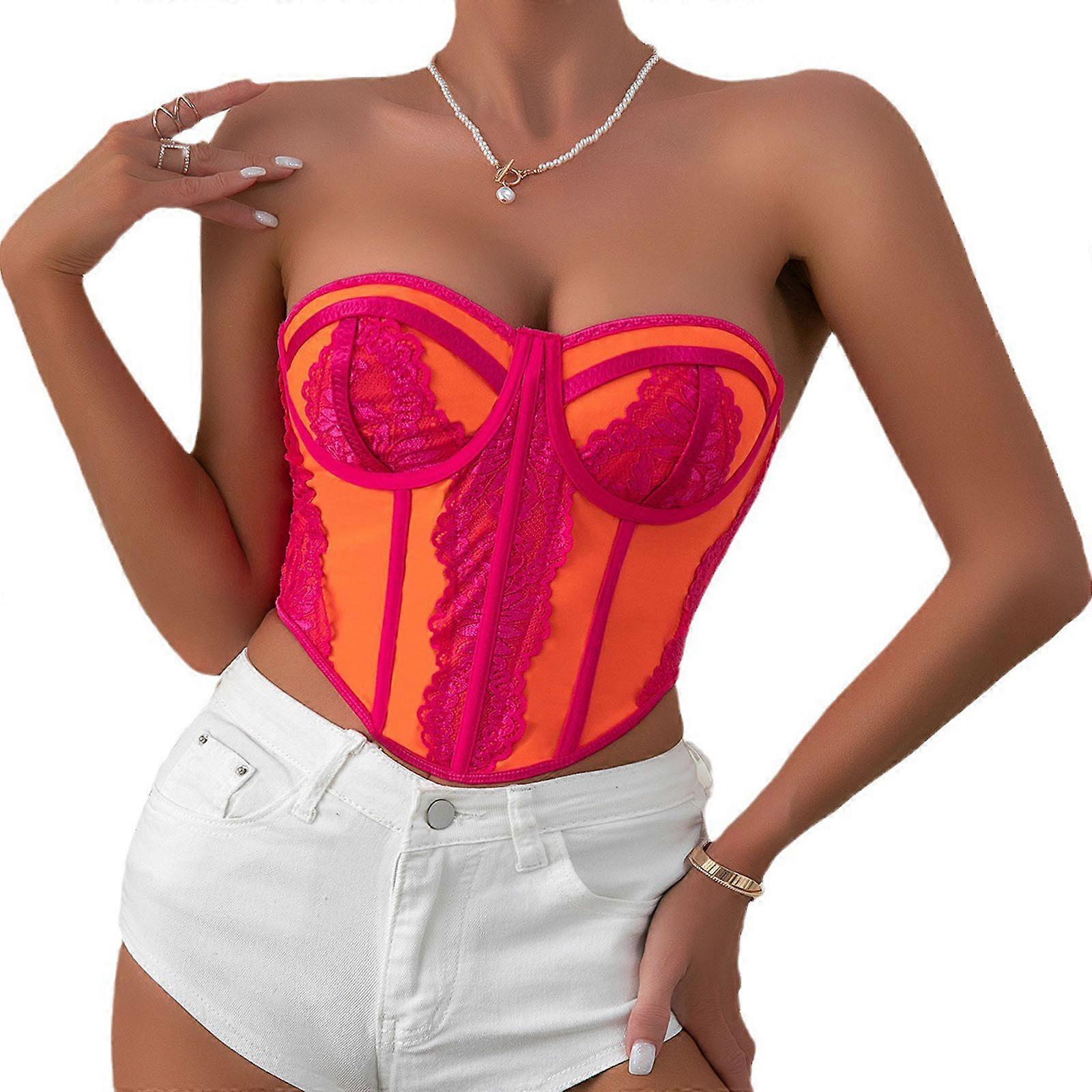 Women Sexy Mesh Bustier Strapless Sleeveless Open Back Crop Tops Lace Boned Overbust Corset Aesthetic Bodyshaper XS orange