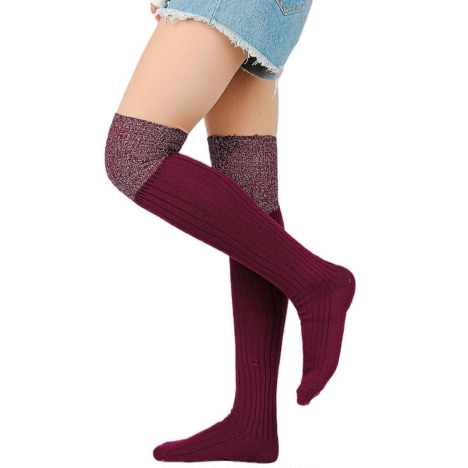 Women Ribbed Thigh High Stockings Metallic Shimmer Contrast Color Over Knee Sock