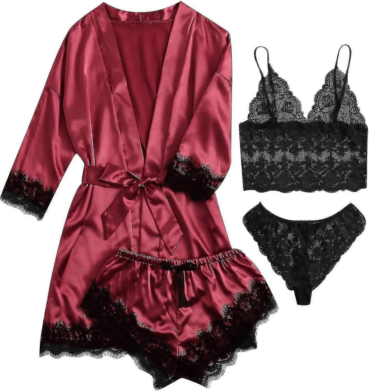 Satin Lingerie For Women, 4pcs Set Silk Pajamas Lace Trim Cami Lingerie Sleepwear With Robe
