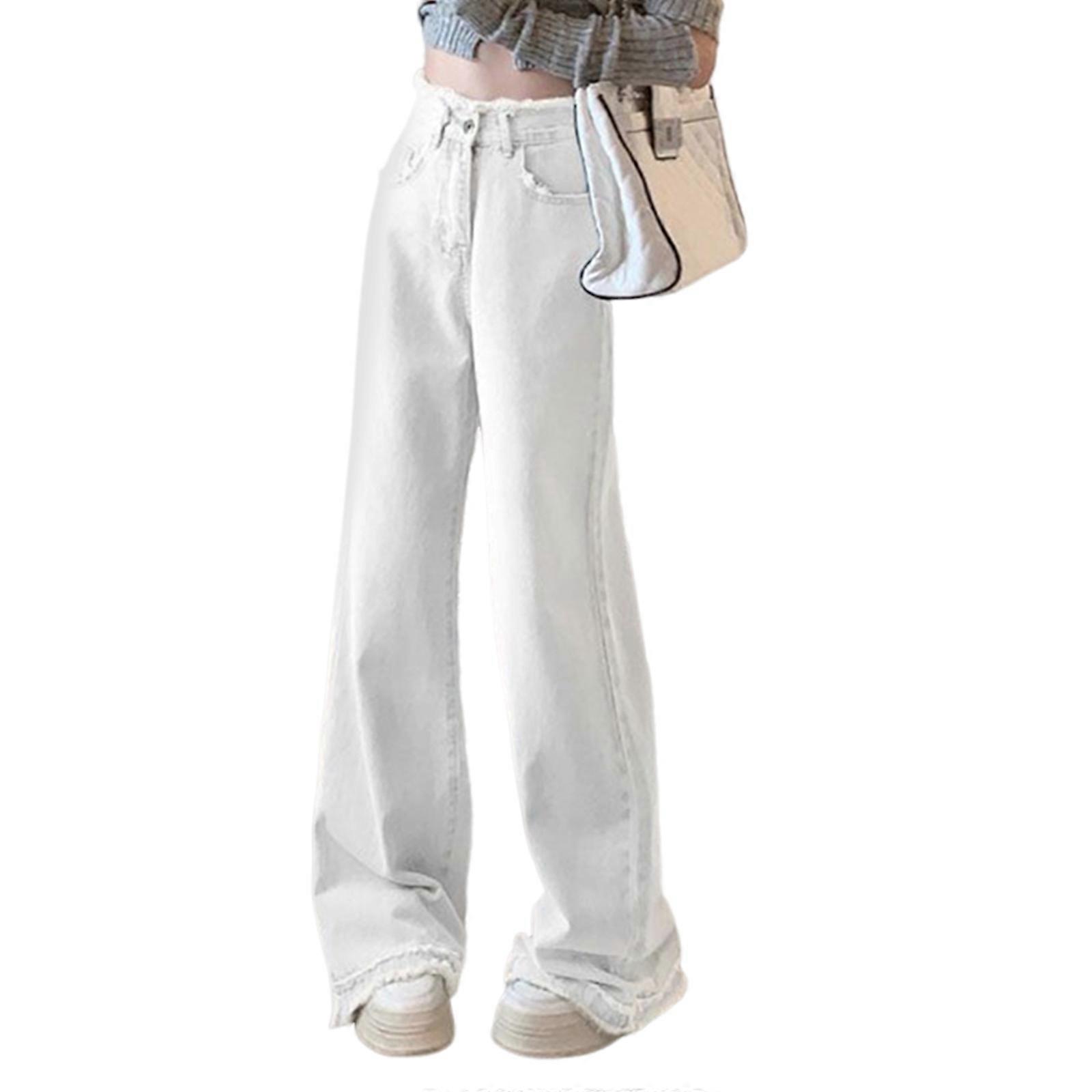 Women Vintage High Waist Wide Leg Straight Pant Jeans 90s Aesthetic Frayed Trim Loose Denims Long Trousers with Pockets White XL