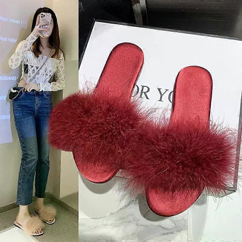 Hot Korean Version of The New Summer Flat Fluffy Slippers Female Wearing Fashion Low Heel Flip-flops Feather Flip-flops