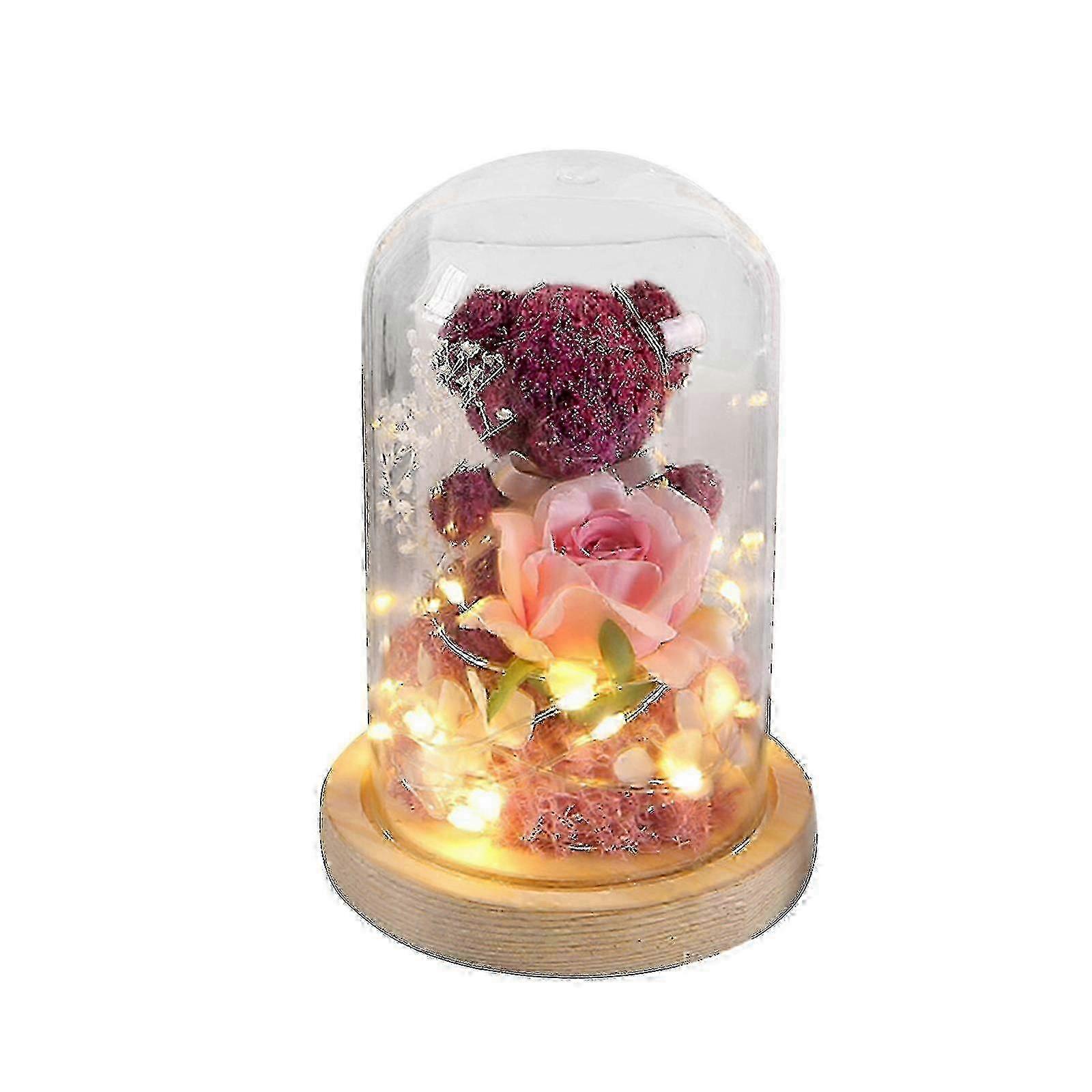 Preserved Pink Rose And Moss Bear In Glass Dome, Light Up Beauty And Rose