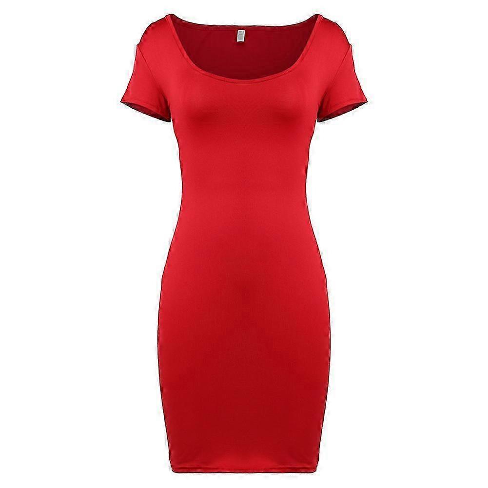 Woman Lady Summer Dress Short Sleeves Solid Color Deep Round Neck Sexy Dress (red XL)