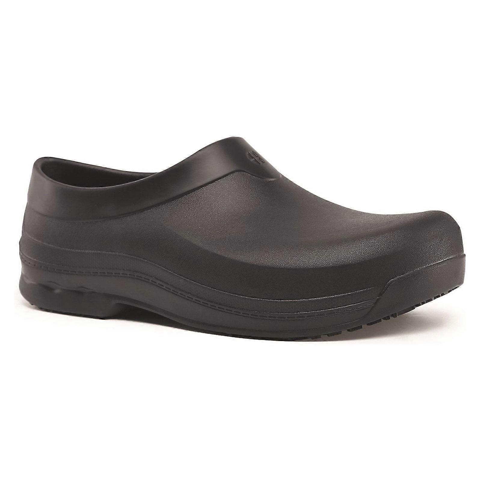 Key Features and Benefits Extra light, durable EVA material Water resistant Different traction patterns across the slip resistant outsole appropriate for the job, work surface and environment Vegan friendly Easy to wash and clean Non-Marking Soles Fitting: Standard Fastening: Slip On Certifications EN ISO 20347:2012 E SRC OB Materials Upper Outer Material: EVA Lining Material: Unlined Sole Material: Rubber