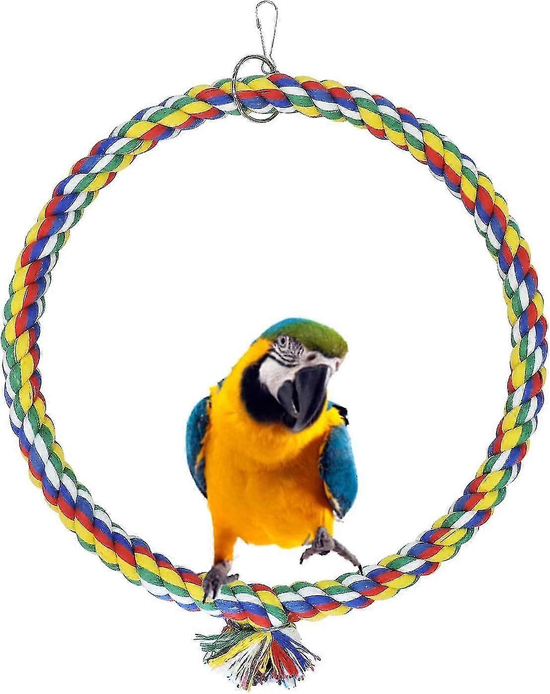 Bird Swing, Cage Hanging Toys Cotton Rope Swing Bite Resistance Perches Toy Parrot ToyDurable Material: The budgie swing is made of high-grade durable cotton rope, which is bite resistant and durable, which fully satisfies the nature of birds like to peck. The accessories are made of stainless steel, which is hard and firm.$Cotton Rope Swing: The birds can swing on the round cotton rope swing, and you can also match multiple round rings for your pet to climb or exercise. Just like jumping around in a tree, they will find it very interesting.$Bright Colors: This cotton bird swing is composed of 4 colors (white, yellow, red and blue). The colors are bright. Birds are easily attracted by colorful toys. They will definitely love this swing.$Easy Installation: Use the metal ring with the swing to hang the cotton rope swing on the cage, which is very convenient and provides an ecological environment for birds to rest and play.$Size: The diameter of the large cotton rope ring is about 25cm, and the diameter of the small cotton rope ring is about 18cm.