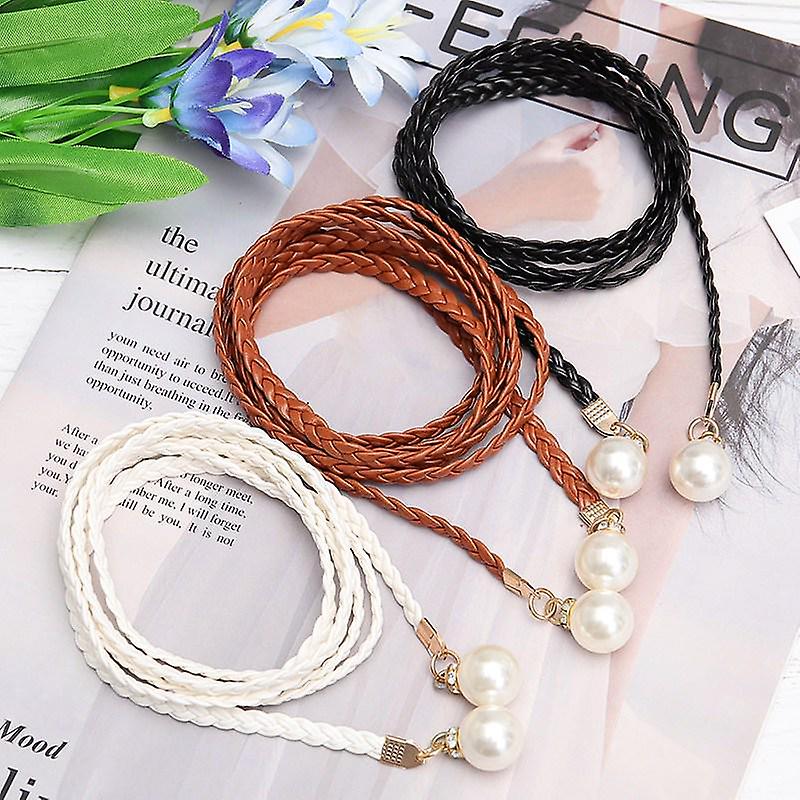 Fashion Woven Leather Dice Dress Imitation Pearl Thin Belt