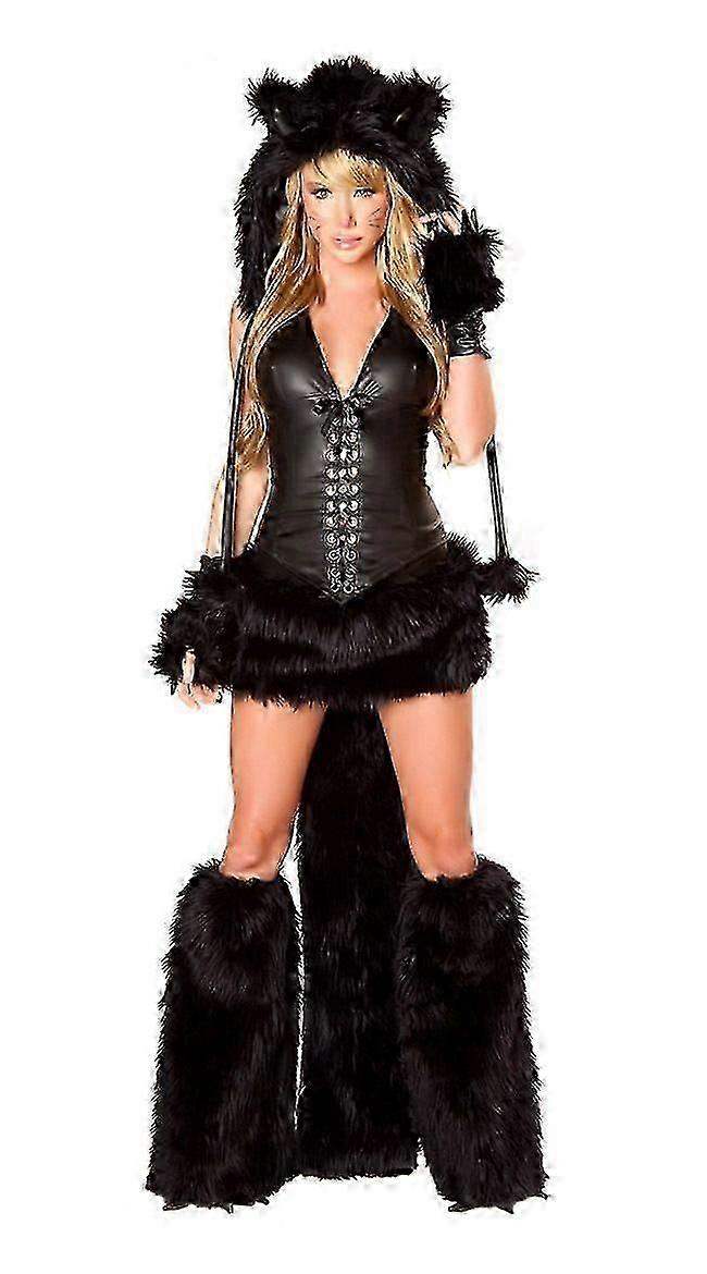 Black Faux Fur Cat Costume Sexy Role Play Outfit Halloween Performance Costume One Size Women