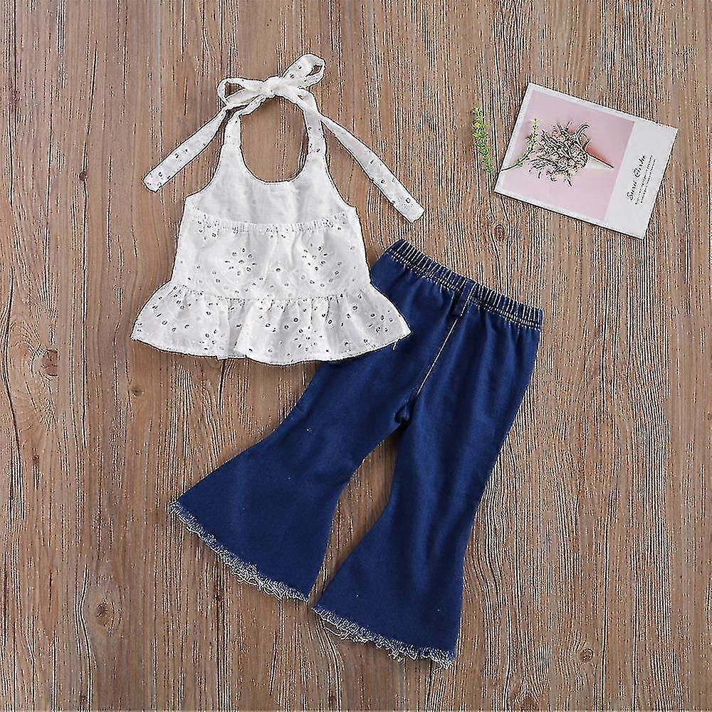 Kids Girls Lace Hollow Halter Vest Tops Denim Flared Pants Outfits Summer
