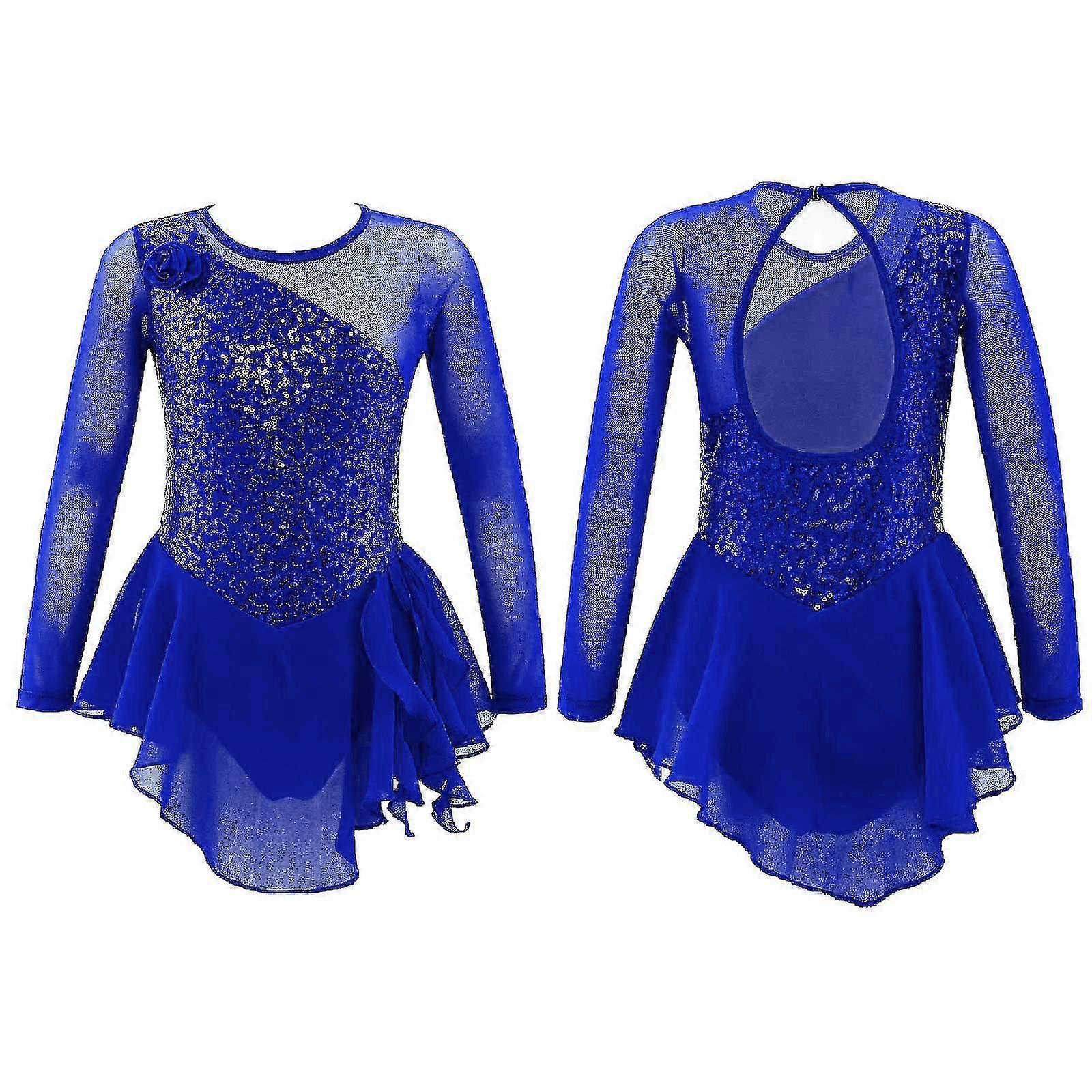 Kids Girl Stylish Figure Skating Dress Long Sleeve Round Neckline Sequins Hollow Back Dresses Ice Skating Ballroom Dance Wear