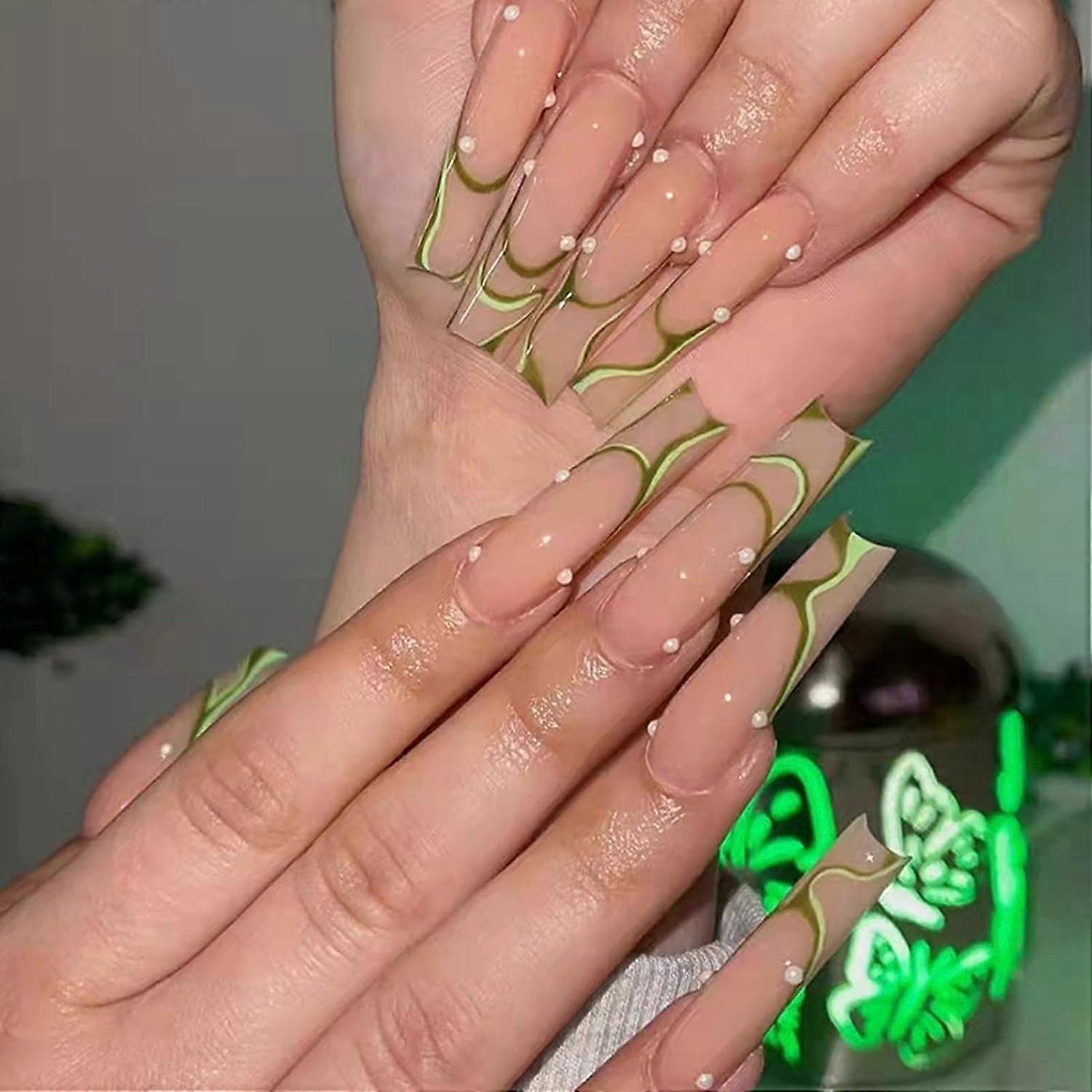 Nails Long, Green swirl Coffin Fake Nails with Designs, Ballerina Stick on Nails for Wo MPN