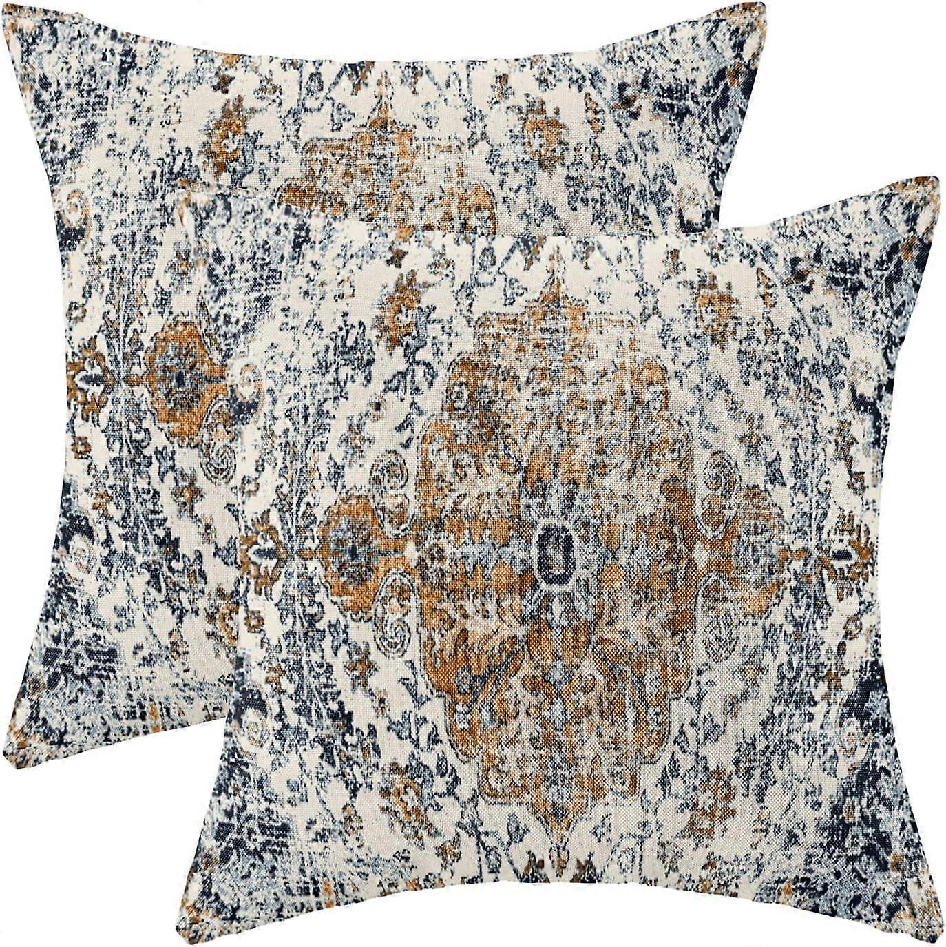 Boho Pillow Covers 16x16 Inch Set of 2,Carpet Pattern Throw Pillows Case,Rust Blue Ethnic Design Outdoor Decorative Square Linen Farmhouse Decor Cushi