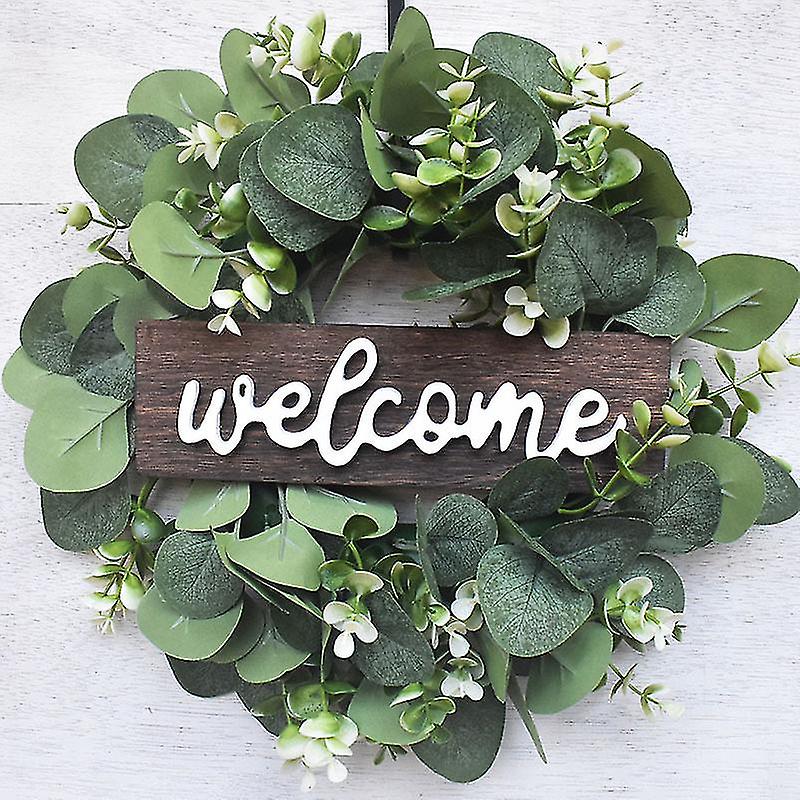 30cm Artificial Eucalyptus Wreath, Faux Leaf Welcome Leaf Garland With Wood Sign-2 Pieces