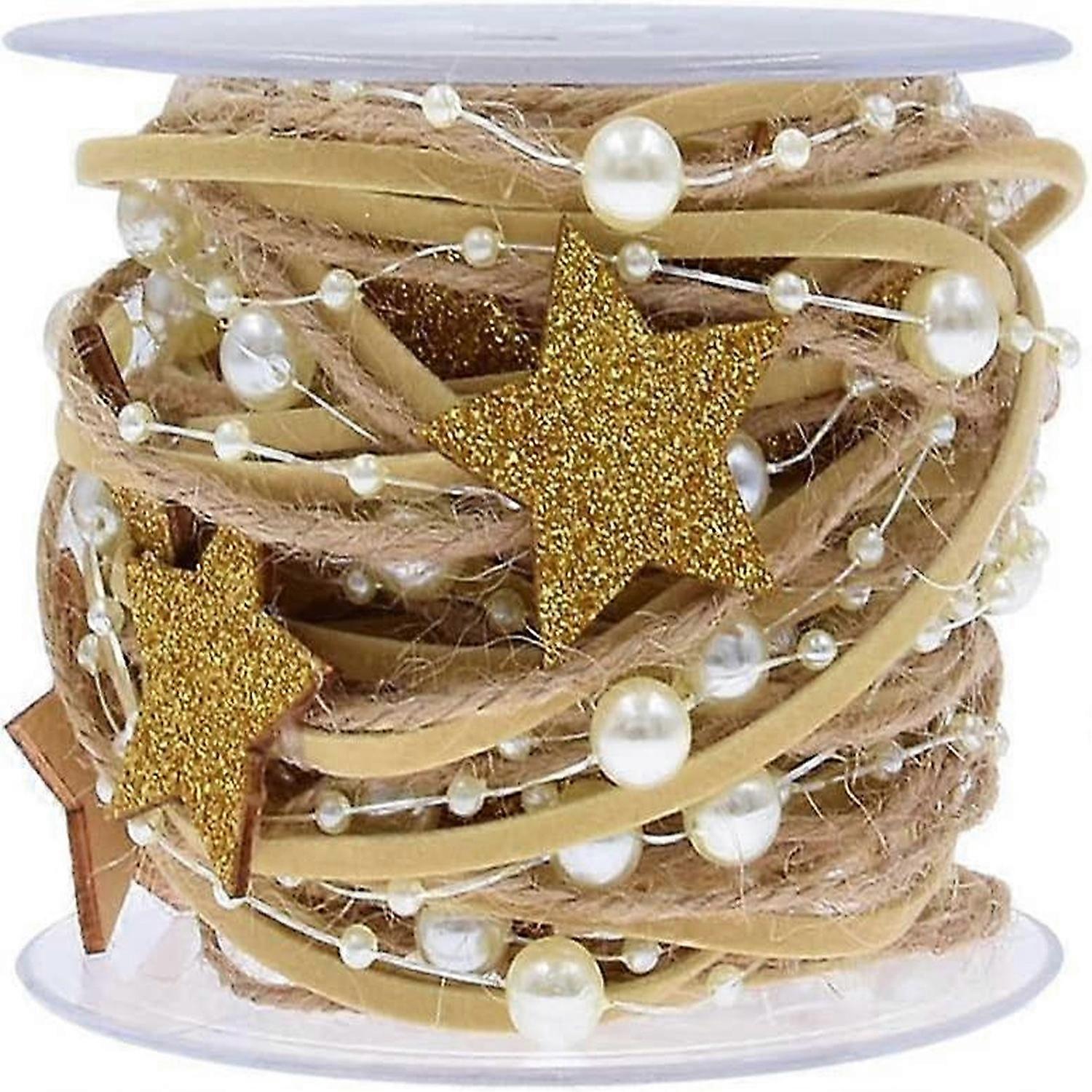 5 m Pearl Garland with Glitter Wooden Star, 8 + 3 mm Pearl Ribbon, Gift Ribbon, Decorative Ribbon, Hanging Decoration, Table Decoration, Decorative Ch
