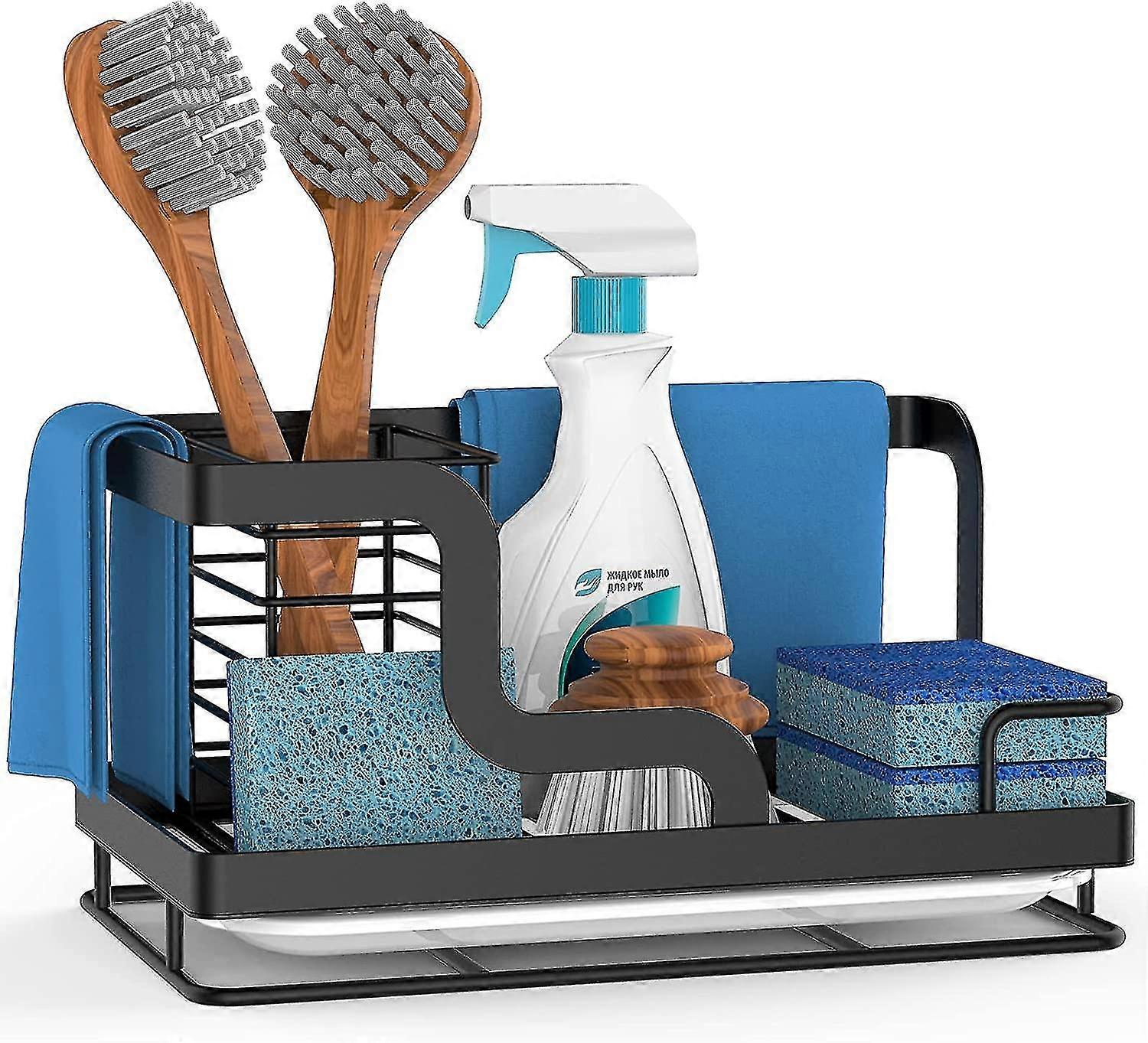 Sink Caddy Sponge Holder, Kitchen Sink Organizer For Dish Rag Soap Brush,dishcloth Holder With Drain Pan 304 Stainless Steel (black)