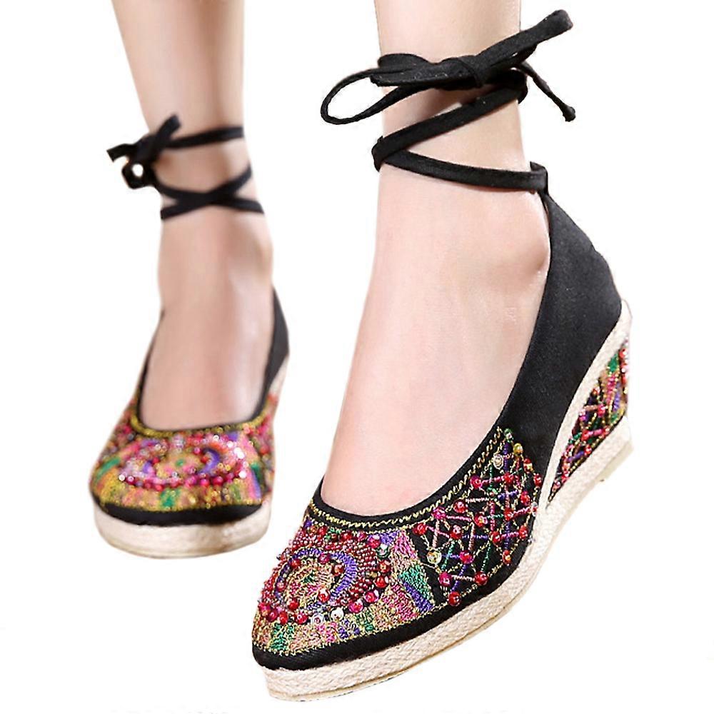 It doesn't pursue fashion but is unique;wear individual grade,conveny inner literary and freshness.Its vintage and fashionable emboridery and small peony and China flower pattern,red is ardent,green is elegant and black is sober;symmetric edge design shows art and vintage;classic plate button design weaves unique smell. Delicate embroidery,colorful string overlap,juxtapose and intervain produces flamboyant but not vulgar color effect;the blent color of dark and light has Chinese painting's render effect;it uses top grade material,color is staid and simple,like go through time's baptism,showing perfect literary smell;it comforms to human engineering,it is comfortable and protects the feet. Wearing it is like going through thousand years time,eyesight like wave,smile like flower,moving step like lotus. Features: pure natural canvas,with little stimulus to the skin,abosorbs sweat and ventilate,is soft and close to the skin,super ventilated and super refreshing soft inner design,classic superior linen material,ventilate and is close to the skin vintage shoelace,elegant,beautiful and decent cotton string embroidery,perfect and delicate cowhell shoe sole,anti-skidding and comfortable,wear ressitant and durable Specifications: vamp material:canvas sole material:cowhells inner material:cotton style:national fashionable element:beads,platform,low-cut,pailette,slipsole,cross bandage,zircon,metal,bandage,embroidery toe cap shape:round upper height:low heel shape:slipsole heel height:high(6-8cm) opening depth:low-cut(less than 7cm) pattern:heart shape suitable season:spring,summer,autumn color:red,green,black size:34,35,36,37,38,39,40 weight:350g